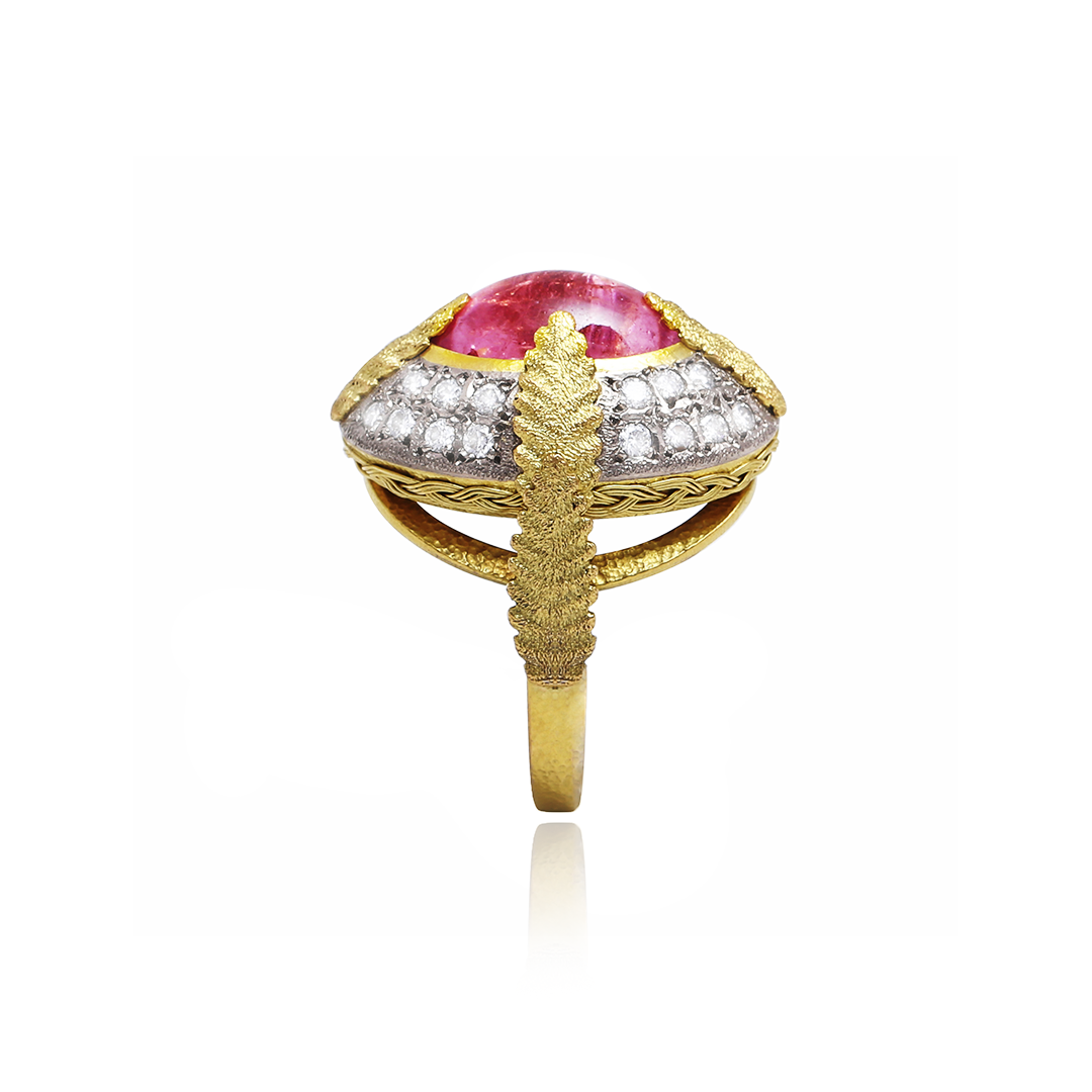 The Imperial Collection reflects the elegance and discipline of the Neoclassical era, where beauty was refined through symmetry, proportion, and harmony. Each piece is sculpted in gold and set with rubellites and diamonds, echoing the artisanal codes of a time when ornament was elevated to art. Laurel details and hand-finished textures speak to a world shaped by ideal form and quiet grandeur.